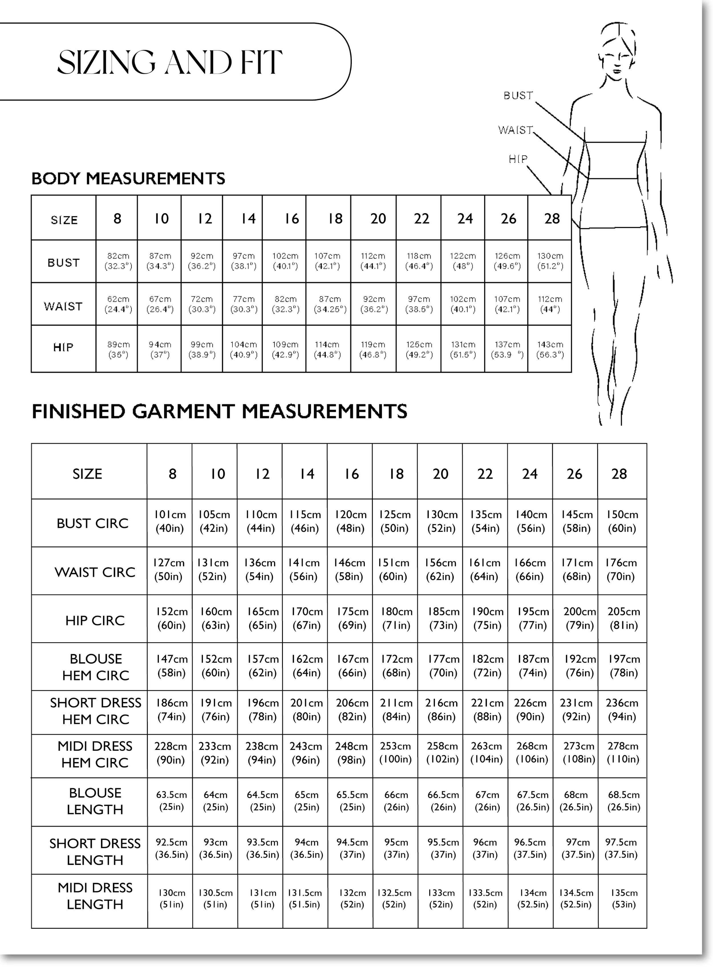 Your fabric must be 150cm wide for ALL SIZES. If you’re using a 115cm/130cm wide fabric you’ll need to add 1cm to the center front and center back seam to create a seam.